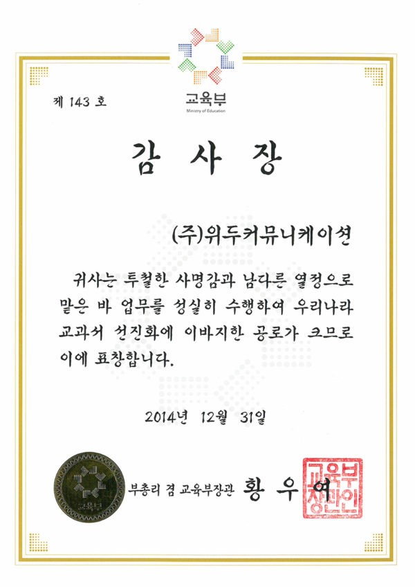 감사장 제 143호 페이지 정보 작성자 WeDu 댓글 0건 조회 4,358회 작성일 19-05-30 19:33 본문 2014-12-31 감사장 제 143호 교과서 선진화 부총리 겸 교육부장관 황우여 List Previous산업통상자원부 표창장 19.05.30 Next한국여성벤처협회 표창장 19.05.30