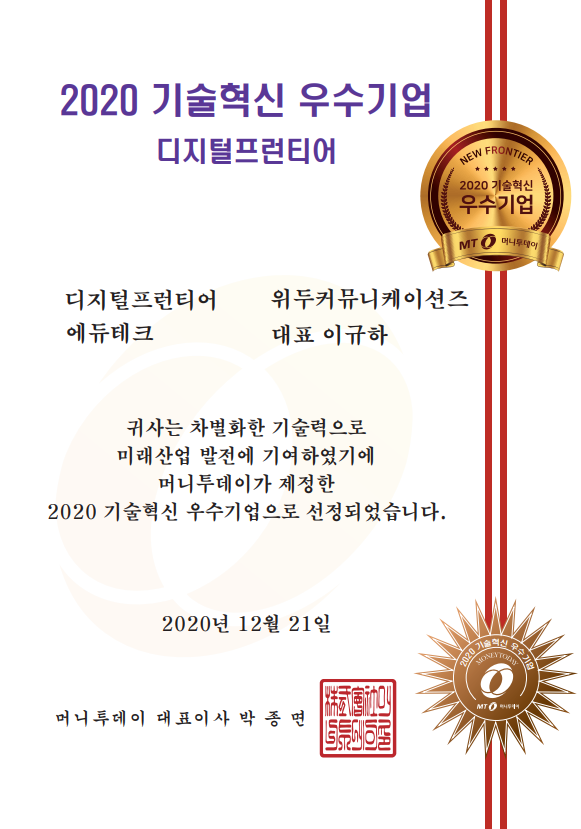 2020 기술혁신 우수기업 페이지 정보 작성자 WeDu 댓글 0건 조회 4,310회 작성일 21-12-31 12:58 본문 2020-12-21 2020 기술혁신 우수기업 디지털프런티어 에듀테크 머니투데이 대표이사 List Previous2020 소년한국 우수 어린이 도서 선정 21.12.31 Next2020 서울산업진흥원 2020 DMC어워드 21.12.31