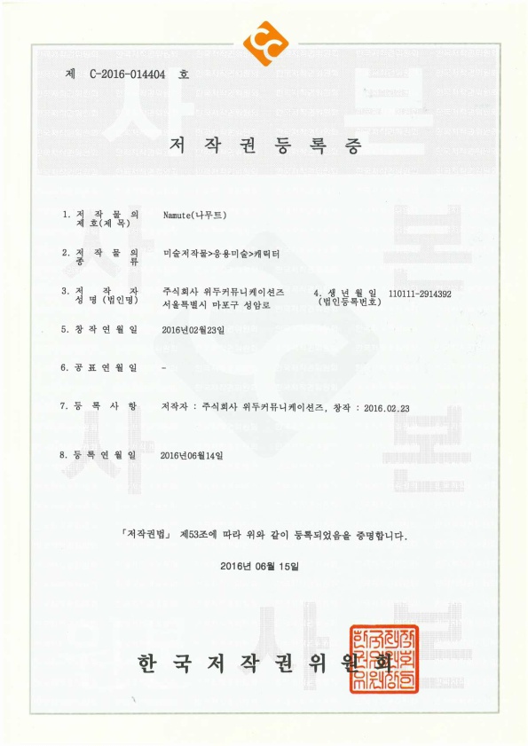 [한국/저작권] 나무트 페이지 정보 작성자 WeDu 댓글 0건 조회 4,537회 작성일 19-05-30 19:08 본문 2016-06-14 저작권 C-2016-014404 나무트 / 미술저작물>응용미술>캐릭터 List Previous[한국/저작권] 리안 19.05.30 Next[한국/저작권] 길리 19.05.30
