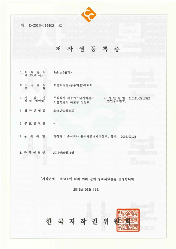 [한국/저작권] 월터 페이지 정보 작성자 WeDu 댓글 0건 조회 4,465회 작성일 19-05-30 19:09 본문 2016-06-15 저작권 C-2016-014403 월터 / 미술저작물>응용미술>캐릭터 List Previous[한국/저작권] 파벨 19.05.30 Next[한국/저작권] 필립 19.05.30