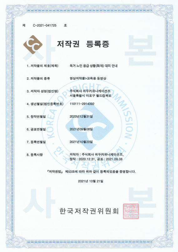 [한국/저작권] 독거 노인 응급 상황(화재) 대피 안내 페이지 정보 작성자 WeDu 댓글 0건 조회 4,552회 작성일 21-12-31 12:41 본문 2021-10-21 저작권 C-2021-041725 영상저작물>교육용 동영상 List Previous[한국/저작권] 장보기 인지훈련 게임 21.12.31 Next[한국/저작권] OLL KIDS/MATH 21.12.31